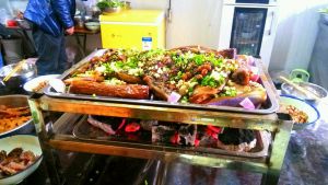 鱼上洒上酥好的花生米和孜然粉,再将炒好的调料加热油调好后淋在鱼盘上,洒上葱花。