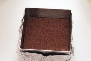 在模具底部放一片蛋糕片,然后往蛋糕上刷一层咖啡酒。
