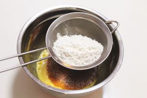 往蛋黄里加入20克糖,然后打蛋器打至糖融化,分三次加入牛奶与玉米,搅拌匀均。