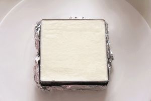 在方形慕斯模具外包一层锡纸,油纸也可以。