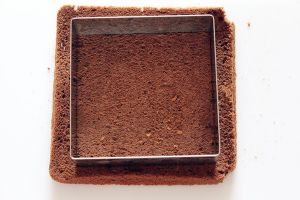 烤好的蛋糕从烤箱中取出迅速倒扣,晾凉后脱模切片。然后用6寸的方形慕斯模具压出两个蛋糕片备用。