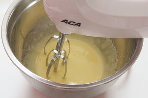 将马斯卡朋用电动搅拌器打至顺滑,加入蛋液混合液中,搅拌至混合。