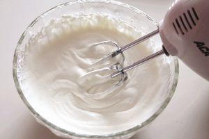 鲜奶油中加入30克细砂糖,搅打至湿性发泡。