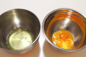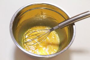 开始制作芝士糊。先将蛋黄用打蛋器打发到浓稠的状态。