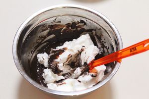 将剩下的蛋清分两次加到面糊中翻拌匀均。