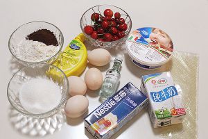 准备食材。 蛋糕用料:鸡蛋四个、低筋面粉70克、可可粉15克、玉米油40毫升、牛奶40毫升、白砂糖80克、柠檬汁少许。 芝士糊用料:马斯卡彭芝士250克、动物性淡奶油150毫升、水75毫升、细砂糖75克、蛋黄2个、朗姆酒15毫升、意大利浓缩咖啡15毫升,吉利丁片10克。 装饰:可可粉适量、樱桃适量。