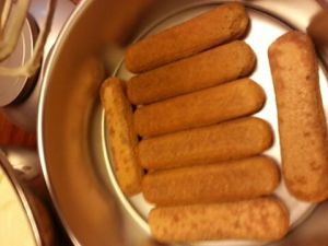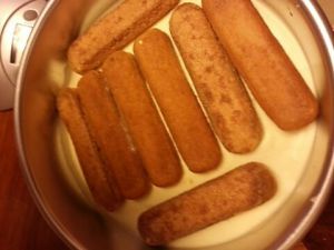 手指饼干在咖啡酒里快速蘸一下,铺在蛋糕模具底部,并倒入一半的马斯卡彭奶酪糊,再继续铺一层蘸酒的手指饼干,再倒入剩下的马斯卡彭奶酪糊