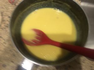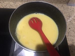 鸡蛋和20g糖混合均匀,加入牛奶拌匀,倒入小锅,最小火加热至85度快沸,不停用木铲搅拌,液体稍粘稠,像可以流动的酸奶,即成蛋奶糊。