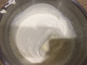 取一个大碗,建议先在冰箱里冷却后拿出来,倒入奶油,奶油打发至可以倒置不掉,不太建议用手持电动mixer,速度太快一下子就过头了,就会变成黄油了。打发好的奶油请冷藏。