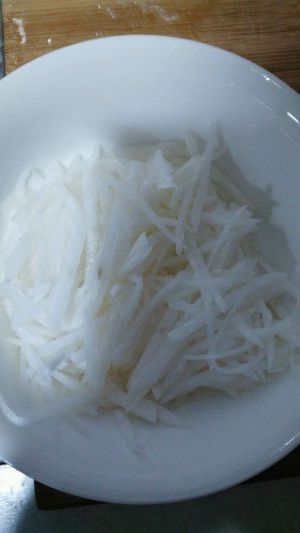 我用的是绿色的水果萝卜,再加入少许胡萝卜丝!也可以用红萝卜,但是做泡菜的那种大白萝卜就不太好吃因为水分太多了!切成丝用一点盐腌一下,杀出水分,也不用太干!盐不能太多,否则会咸哦!
