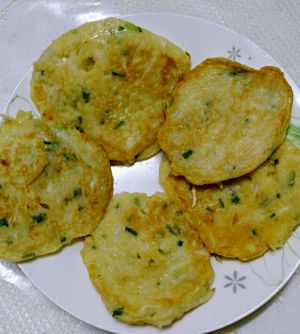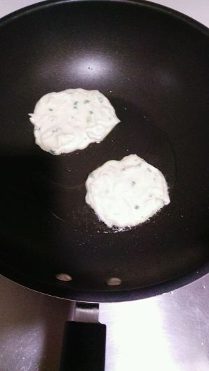 放点油加热,小火,用勺子舀煎成薄饼,翻面