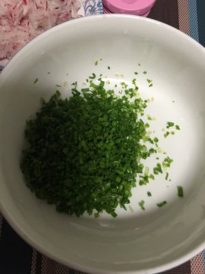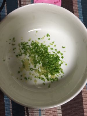 大虾挑去虾线去掉虾壳剁成虾泥,放1小勺食盐,半大勺料酒腌制一会,香葱切末备用