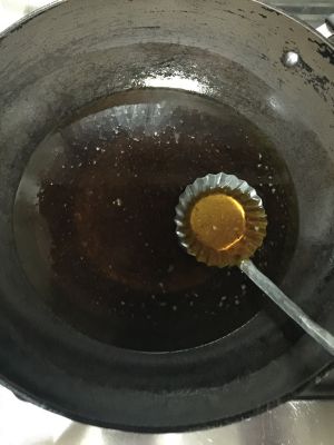 油端勺子进热油锅,这样容易脱模,先一勺面在放萝卜丝压紧,在一勺子面就可以下油锅了,我们家这油端模具年代久远了,必须换新了……如果不方便脱模就我西餐叉子挑一下。