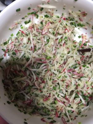 萝卜用刀切丝,个人不喜欢用擦板擦,那样的萝卜丝太细,水分流失多,炸完没有萝卜的鲜味。 葱切碎,打两鸡蛋,面粉,盐,十三香,都倒进去,觉得筷子搅不好,就用手拌。