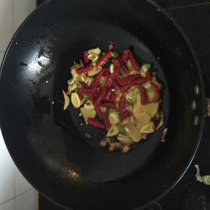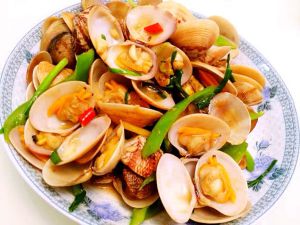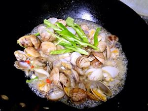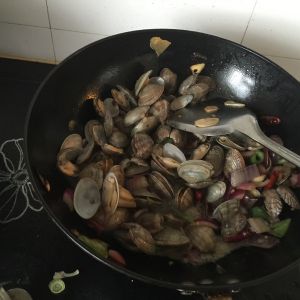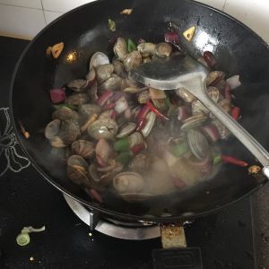 大火热油下干辣椒、姜丝、大葱或葱白、蒜片翻炒片刻,入花蛤翻炒,部分花蛤开始张口时倒入料酒和耗油,翻炒至所有花蛤张口酌情加入盐、葱花和麻油,起锅。