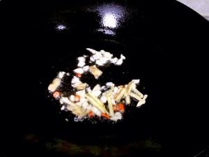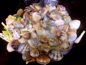 放入花蛤翻吵片刻即其开口后放盐,生抽,白酒。