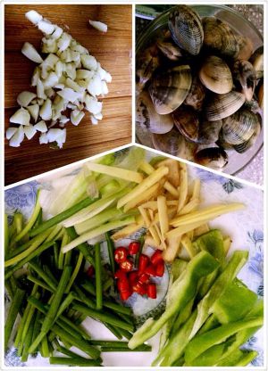 花蛤洗净,小葱切段,姜切丝,小米椒切碎,蒜切碎,青椒切条