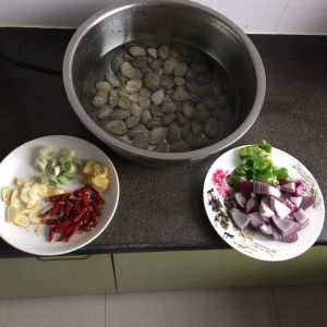 备好所有材料。花蛤用水泡一会之后用手戳洗,直到清洗的水是干净的。如果买回来的花蛤吐泥不好的话,用盆加水加盐7泡一段时间。