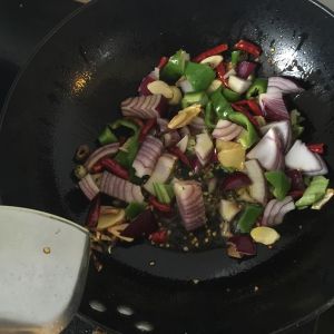 加入干辣椒,青辣酱,麻椒。洋葱。炒出来香味。加入花蛤。