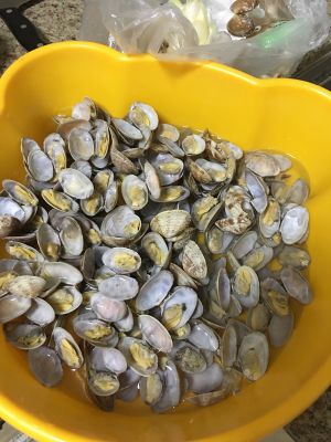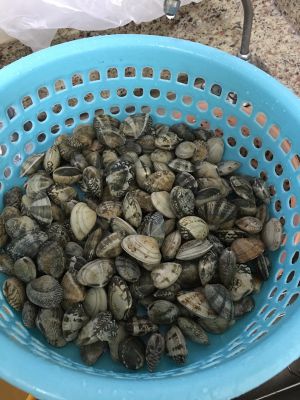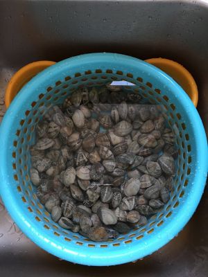 花蛤泡两小时以上,吐净泥沙,用刷子刷净,稍微控一下水
