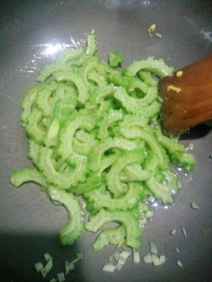 大火炒苦瓜后下鸡蛋,根据需要放水,等汤沸后添加适量鸡精即可盛起