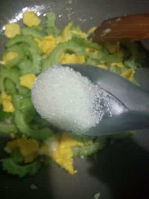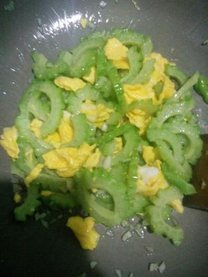 苦瓜炒软后下入炒好的鸡蛋,加盐炒匀,加少许香油出锅。