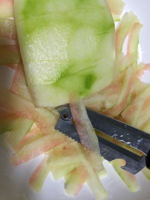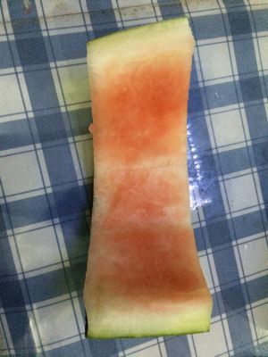 西瓜皮去瓤去皮,红色的去干净,因为比较软不脆,而且有明显的甜味。