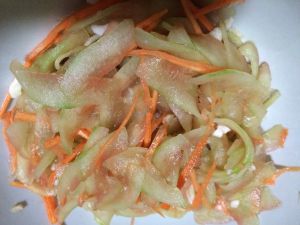 腌西瓜皮的时间把胡萝卜切丝,蒜拍碎。西瓜皮腌好后要用凉开水过一下,挤干水。