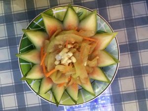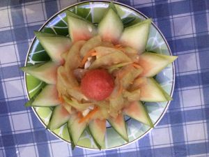 最后,把西瓜球放在中间,美味又健康的凉拌西瓜皮就完成了!