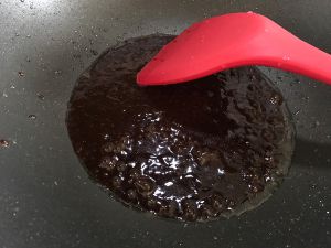 锅中另加油,倒入用清水调好的甜面酱,小火翻炒至酱汁浓稠。