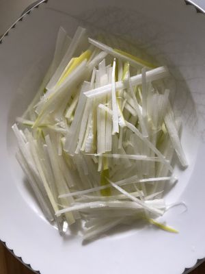 在切好的肉丝中加入水淀粉、料酒、姜片拌匀后腌制20分钟,同时取葱白部分切成细丝。将三种酱料混合均匀后备用;