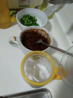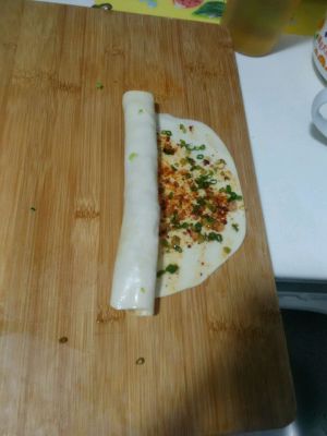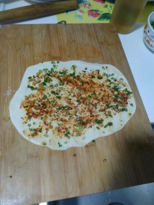 3、将准备好的面团擀成面皮,洒上盐、辣椒油、葱花。(擀面时最好在面团上抹点油防止粘帖黏)