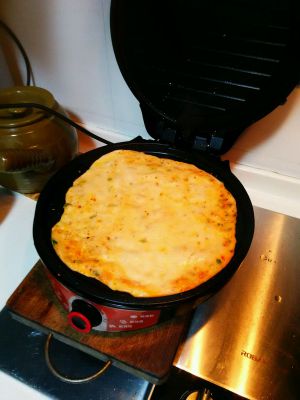 锅底少量油,刷均匀。油热,放入饼,大火转小火,盖锅盖。