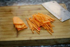 胡萝卜洗净后切片,在切成和韭芯差不多长的丝
