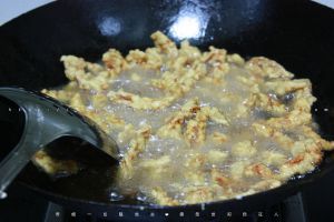 捞出,再次烧热油复炸一次,复炸速度要快,10几秒钟就捞出来控油备用