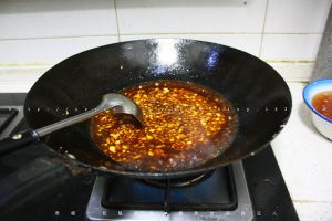 锅留底油烧热,倒入番茄酱,姜蒜末,煸炒出红油。