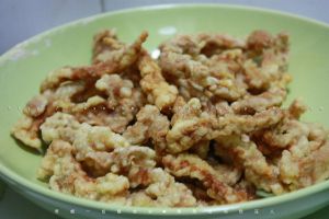 将腌好的肉条放里面糊里,面糊裹厚点,放进油锅里炸至金黄捞出。
