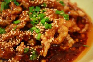 将里脊肉洗净,切成小条。 放入碗中 放料酒,少许盐入味。 鸡蛋清一个,淀粉和面粉勾兑成糊 热锅下油,将肉条放入面糊中挂糊均匀。 油温适中是下肉条,炸至金黄捞出,(肉条要一条一条的放入油锅中,不用翻动,炸熟后会自动漂浮起来) 将炸好的里脊肉备用,净锅加适量水,放入白糖适量(根据个人口味) 放番茄酱 小火煮至绯红 倒入炸好的里脊肉 翻炒均匀 最后勾薄芡 装盘 撒上熟芝麻即可。
