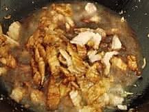 揭开锅盖,沿着锅沿四周倒入刚才小碗里的汤汁,继续加盖焖几分钟。