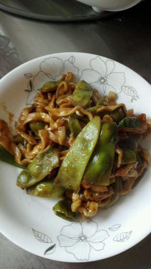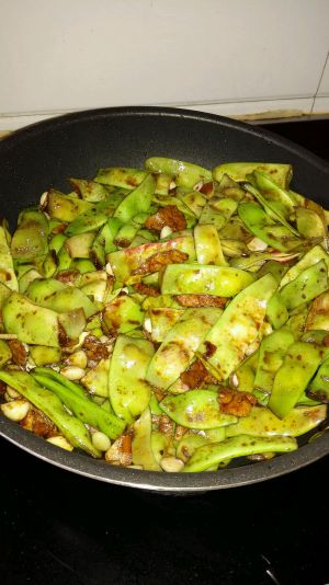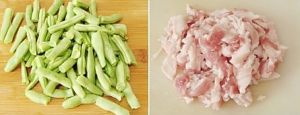 扁豆掐掉两头,去丝。掰成寸段。洗干净备用