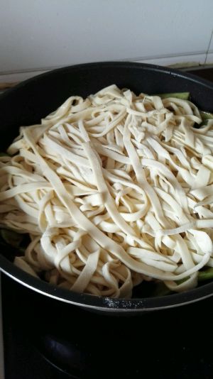 拌过油的生面条松松的抖散放入锅里,覆盖于食材之上,加盖中火焖6、7分钟。这个步骤,与我们四川的“孔饭”有异曲同工之妙。