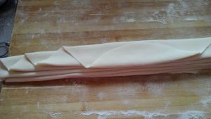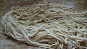 按惯例的食材合影留念图:新鲜手擀面、扁豆、五花肉、胡萝卜和土豆。
