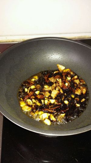 加入八角桂皮,继续爆,直至五花肉皮焦黄。