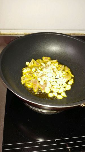葱姜蒜洗净切好,放油煸香。我爱吃辣,还放了几个鲜红椒。