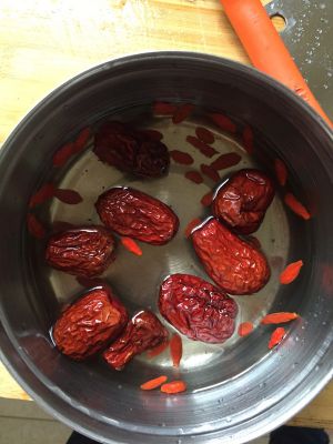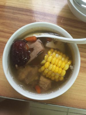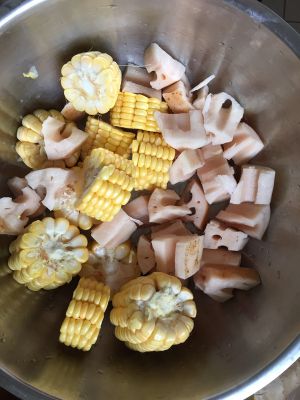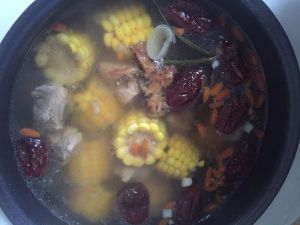 煮开后加入玉米,莲藕,红枣和枸杞然后转小火慢炖约30分钟。