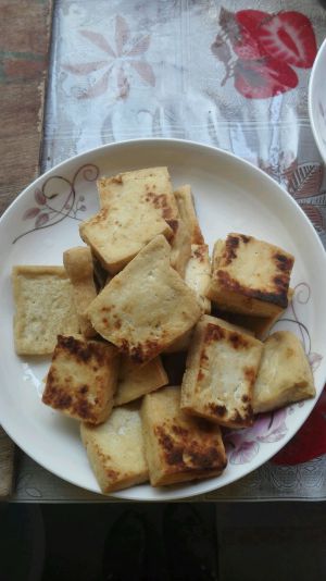 锅中倒入油,大火加热待油7成热时,改成中火,放入豆腐,双面煎成金黄色。