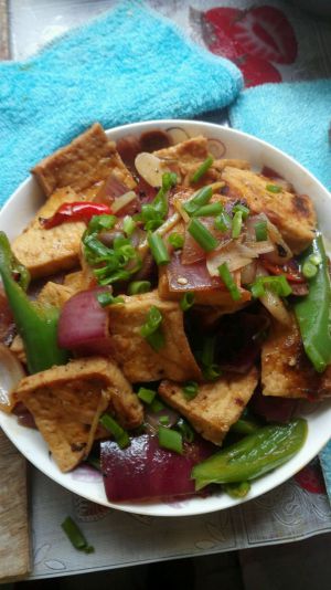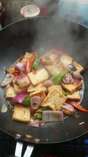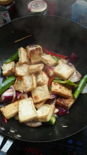 把洋葱,姜,蒜,辣椒炒到半熟,加入煎好的豆腐