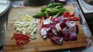 豆腐切大约一公分的块,蒜苗斜切,绿、白分开,备好花椒、八角、干辣椒。