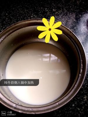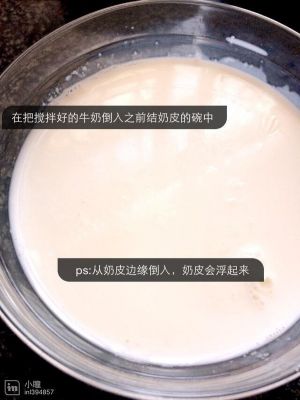 用牙签将晾凉的牛奶皮挑起一点,将3/4牛奶倒入奶锅