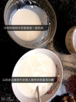 冷却的纯牛奶表面会结一层皮,从边缘将砂糖蛋清缓缓倒入碗中